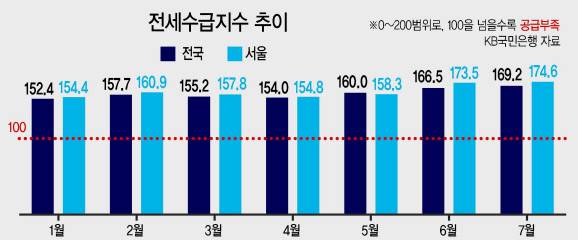 18일 KB국민은행의 월간 전세 수급 동향에 따르면, 7월 기준 서울의 전세수급 지수는 174.6으로 2016년 4월 이래 가장 공급이 부족한 것으로 집계됐다. 전국으로 범위를 확대하면 169.2로 역시 4년3개월간 전세 구하기가 가장 어려운 것으로 집계됐다.