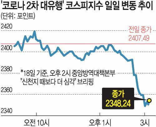 18일 코스피는 코로나19 확진자 수 급증으로 59.25 포인트(2.46%) 내린 2348.24에 마감했다. 지난 6월 15일(-4.76%) 이후 최대 하락폭이다. 오전 장중 -0.07% 수준에서 보합세를 이어가던 코스피는 질병관리본부 중앙방역대책본부(방대본)의 브리핑이 시작된 오후 2시를 기점으로 급락세를 연출했다. 증시 상승세를 이끌던 개인 투자자들이 무려 5266억원어치의 매물 폭탄을 쏟아내며 지수 하락을 주도했다. 이날 오른 종목은 66개에 그친 반면, 내린 종목은 827개에 달했다. 코스닥 역시 4.17% 급락한 800.22에 장을 마쳤다. 장중 한때 800선 밑으로 떨어지기도 했다.