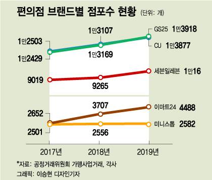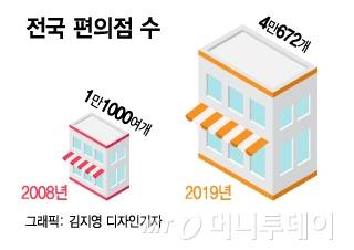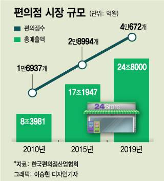초창기때만 해도 동네 슈퍼마켓보다 비싸다는 인식이 있었지만, 1인가구 증가 등 인구구성이 변하면서 소량 구매가 보편화되면서 편의점 시장은 급성장했다. 한국편의점산업협회 집계에 따르면 2007년 전국 편의점 수 1만개를 넘어선 이후 2011년엔 2만개 돌파, 지난해 말 기준 점포수 4만672개에 달한다. 전체 매출액은 약 24조8000억원으로 커졌다. 이는 협회에 포함된 5개사(GS25·CU·세븐일레븐·미니스톱·씨스페이스)만 기준으로 집계했을때 결과(이마트24 등 제외)여서 전체 편의점 점포수와 매출액은 더 커질 수 있다.