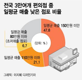 우 의원에 따르면 3만여개 편의점 중 일평균 매출 150만원 미만 점포가 47.8%를 차지했다. 1만5800개가 여기에 해당됐다. 영업이익 적자를 기록하는 일평균 매출 110만원 이하 편의점은 21.1%,로 5군데 중 1군데는 적자인 것으로 파악됐다. 초저매출점포로 분류되는 일평균 매출 80만원 이하 점포도 6.7%로 집계됐다.