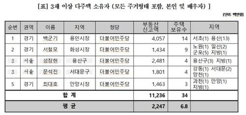 백군기 용인시장이 총 14채의 주택을 보유해 최다 주택보유자에 이름을 올렸다. 백 시장은 서울 서초구 아파트 1채와 배우자 소유 용산구 연립주택 13채를 보유했다. 정작 용인에는 소유한 주택이 없었다.
