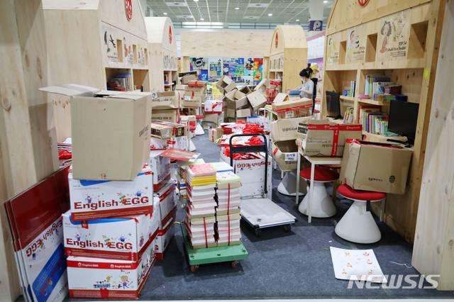 코로나19로 베이비페어 행사 취소, 부스 철거하는 관계자들