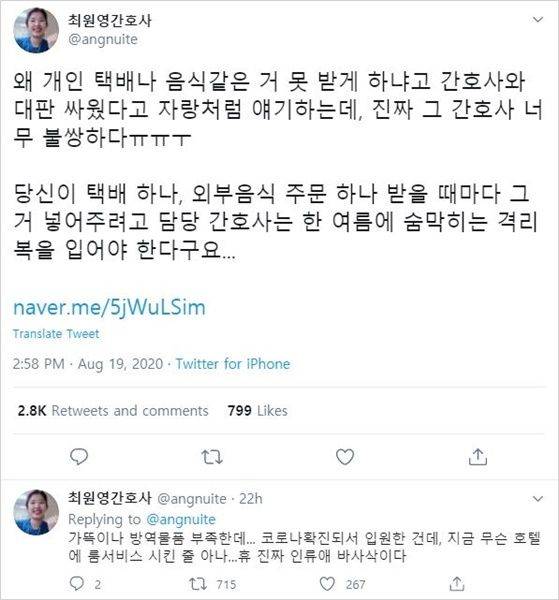 최 간호사는 "진짜 그 간호사 너무 불쌍하다. 당신이 택배 하나, 외부 음식 주문 하나 받을 때마다 그거 넣어주려고 담당 간호사는 한여름에 숨 막히는 격리복을 입어야 한다고요"라고 지적했습니다. 덧붙여 "가뜩이나 방역물품 부족한데... 코로나 확진되서 입원한 건데 지금 무슨 호텔에 룸서비스 시킨 줄 아나"라며 "휴 진짜 인류애 바사삭이다"라고 토로했습니다.