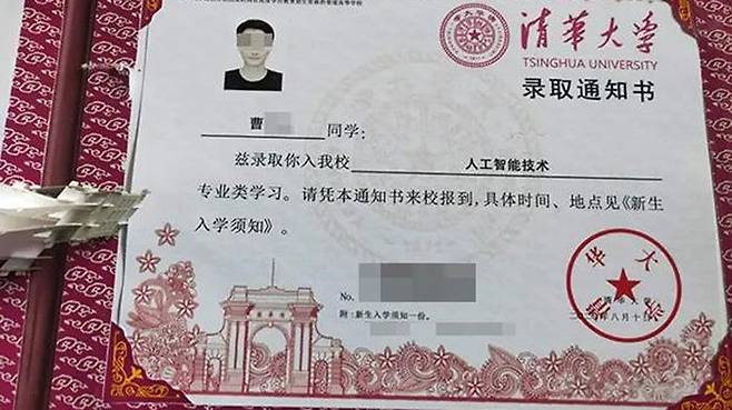 입학 통지서에는 차오 군이 칭화대 인공지능기술전공에 합격했다고 적혀 있었습니다. 그런데 통지서에 오타가 있었습니다. '고등(高等)학력'이라고 돼 있어야 하는 곳에 '고도(高度)학력'이라고 써 있었고, '보고(報到)'도 '보도(報道)'로 돼 있었습니다. 이를 수상히 여긴 마을 관계자가 교육 당국에 확인을 했고, 통지서가 위조된 것으로 확인됐습니다.
