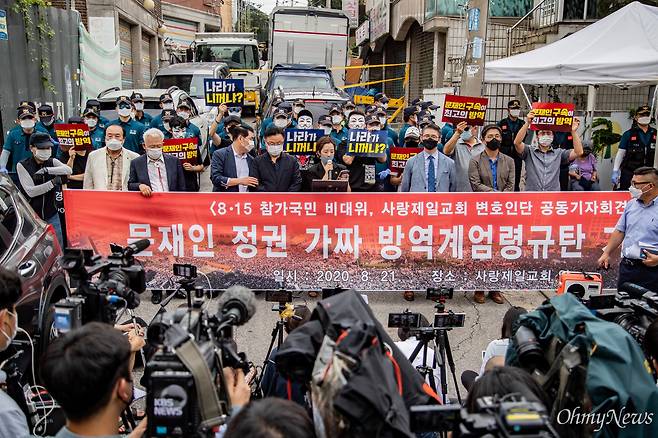 | ▲ 사랑제일교회 관계자들이 코로나19에 집단 확진된 가운데, 21일 오전 서울 성북구 장위동 사랑제일교회앞에서 전광훈 목사 변호인 강연재 변호사 등이 참석한 가운데 '문재인 정권 가짜 방역계엄령 규탄 기자회견에'이 열리고 있다. |