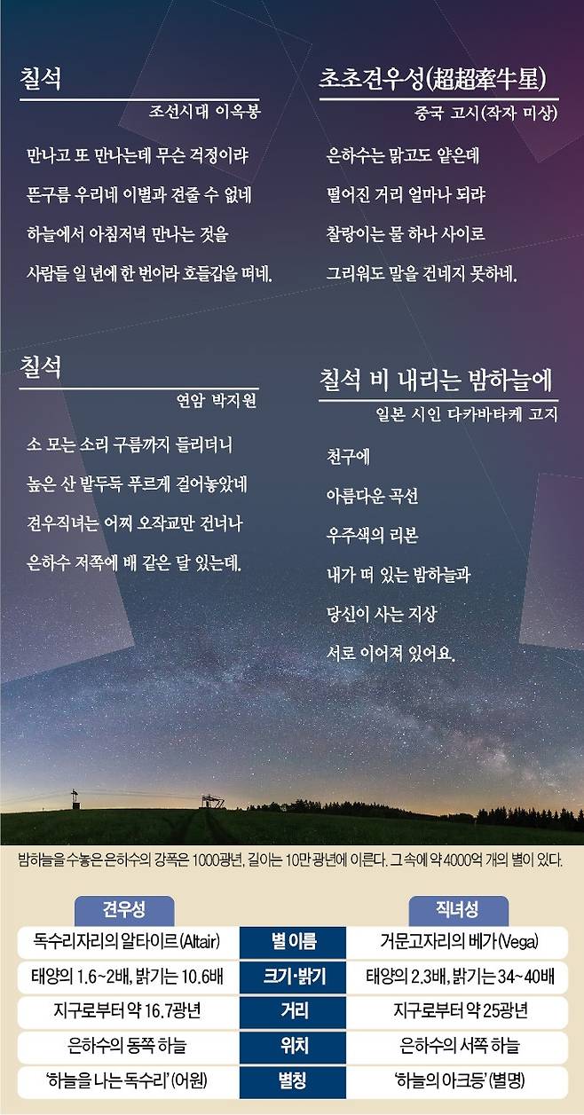 시인들의 상상력은 이런 시공간을 단숨에 뛰어넘는다. 조선 중기 여성 시인 이옥봉은 ‘칠석’이란 시에서 ‘만나고 또 만나는데 무슨 걱정이랴/뜬구름 우리네 이별과 견줄 수 없네/하늘에서 아침저녁 만나는 것을/사람들 일 년에 한 번이라 호들갑을 떠네’라며 우리 눈을 우주의 시각으로 확장시켰다.