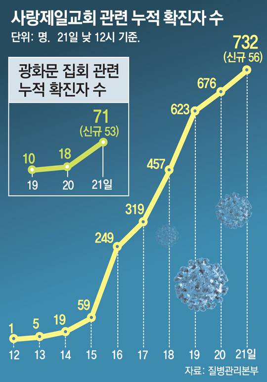 19일 경기 남양주시에서 확진 판정을 받은 사랑제일교회 한 교인은 “검사 결과를 믿지 못하겠다”며 행방이 묘연해진 뒤 서울 강남세브란스병원에서 진료 대기 중인 상태로 발견됐다. 17일 경기 포천시에서는 사랑제일교회 교인 부부가 검체를 채취하러 온 보건소 직원을 껴안고 침을 뱉으며 난동을 부린 뒤 확진 판정을 받았다. 사랑제일교회 관련 코로나19 확진자 수는 12일 1명이 발생한 후 9일 만인 21일 낮 12시 기준 전국 11개 광역단체에서 732명으로 늘어났다. 전날 오후 6시까지 사랑제일교회 관련 3415명을 조사한 결과인데 검사대상자 중 양성률이 21.6%에 달할 정도로 대규모 감염 위험성이 크다. 사랑제일교회 교인이 참여한 광복절 집회 관련 확진자도 71명으로 늘었다. ‘n차 감염’도 문제다. 콜센터와 교회, 학교, 병원 등 19곳에서 100명에게 전파됐다.