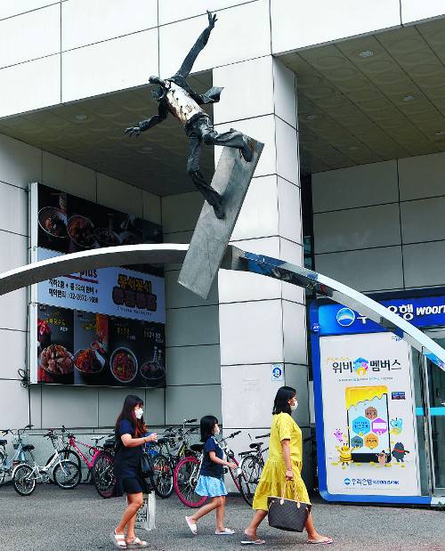#1. 13일 낮 서울의 지하철 2호선 문래역 4번 출구. 이 출구와 붙어 있는 홈플러스 영등포점이 목적지였다. 건물 측면 통로에 사람들이 오간다. OO은행 ATM기에서 자식들이 입금한 용돈을 찾아 나오는 것 같은 할머니, 지하철로 갈아타려는지 자전거를 거치대에 세워두는 할아버지, 아이가 유치원에 가 있는 시간을 이용해 장을 보려는지 바삐 걷는 젊은 주부…. 이런 보통 사람들의 일상을 지켜보는 조각물이 있다. 그들의 남편이거나 아들일 수 있는 ‘샐러리맨’을 형상화했지만, 모두 무심히 지나친다. 너무 높이 솟아 있어서, 혹은 비명을 지르는 것 같은 표정을 볼 수 없어서 그런지 모르겠다고 생각했다. 이 작품이 구본주(1967∼2003) 작가의 ‘지나간 세기를 위한 기념비’(2001)임을 알리는 안내판은 어디에도 없다.