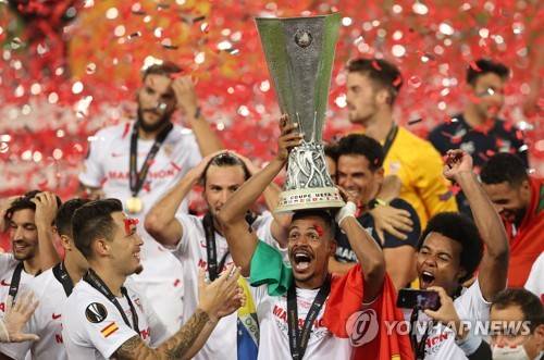 epa08617354 Players of Sevilla celebrate with the trophy after winning the UEFA Europa League final match between Sevilla FC and Inter Milan in Cologne, Germany 21 August 2020. EPA/Lars Baron / POOL