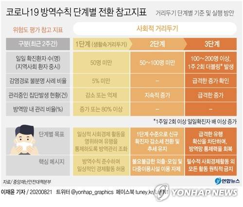 다만 환자 발생 수와 집단감염 사례가 작아 상대적으로 방역적 필요성이 떨어지는 강원·경북지역의 경우 핵심 조치를 강제하지 않고 일단 권고 상태에서 2단계를 적용하기로 했다.