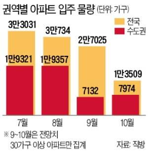 오는 10월에도 아파트 입주 물량이 감소할 것으로 예상된다. 직방 집계에 따르면 10월 전국 아파트 입주 예정 물량은 1만3509가구로, 9월 예상치보다 50%가량 줄어든다. 수도권 입주 예정 물량은 7974가구로 비슷한 수준이다.