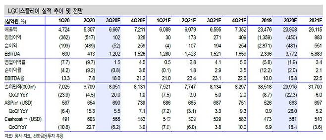 신한금융투자는 LG디스플레이가 3분기 매출액 6 조 6670억원, 영업이익 1020억원으로 전분기 대비 매출은 14.5% 증가하며 흑자전환 할 것으로 예상했다. 이는 7분기 만의 흑자전환이다.