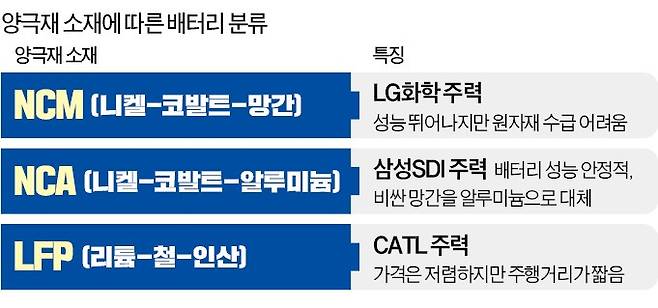 현재 배터리 시장은 크게 니켈 양극재 계열인 NCM(니켈-코발트-망간), NCA(니켈-코발트-알루미늄) 배터리와 리튬 양극재 계열인 LFP(리튬-철-인산) 배터리가 양분하고 있다.
