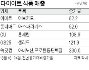 편의점에서는 1인 가구를 공략한 소용량 다이어트 제품이 인기다. 편의점 CU에서는 지난 18~24일 훈제란 판매량이 전년 동기 대비 108.9% 급증했다. 닭가슴살 제품과 칼로리가 낮은 ‘식물성 음료’로 꼽히는 아몬드 음료도 같은 기간 매출이 60~70%가량 늘었다. 최근 편의점들이 강화하고 있는 샐러드 상품군 매출도 급증했다. GS25에서는 같은 기간 샐러드 제품 매출이 121.9% 증가했다. 한 끼 식사로 먹을 수 있게 소포장된 제품들이다.