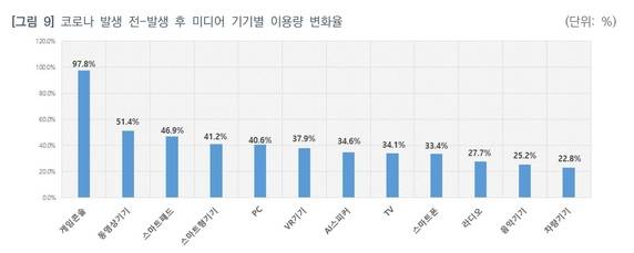 27일 한국콘텐츠진흥원에 따르면 국내 코로나19 발생 전·후 미디어 기기별 하루 평균 이용량 변화율을 살펴본 결과 게임콘솔, VR 기기의 전년 대비 이용량 증가율이 역대 최대 수준을 기록했다. 게임용 콘솔의 경우 하루 평균 이용량 증가율이 97.8%, VR기기는 37.9% 늘었다. 진흥원은 게임용 콘솔기기의 경우 코로나 종료 이후에도 하루 평균 이용량 증가율이 44.5%, VR기기 역시 41.2%로 40%대를 유지할 것으로 전망했다.
