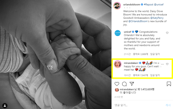 현지 시간으로 26일 미란다 커는 득녀 소식을 전한 배우 올랜도 블룸 인스타그램에 "정말 행복해. 아기가 너무 보고 싶어 (I'm so happy for you guys. Can't wait to meet her)"라며 축하 댓글을 남겼습니다.