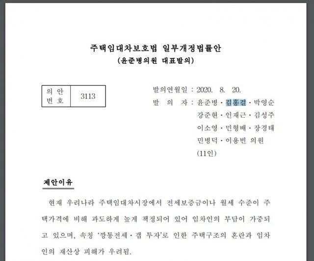 그로부터 8일 뒤인 지난 20일, 김 의원은 같은 당 윤준병 의원이 대표발의한 주택임대차보호법 개정안에 이름을 올렸다.