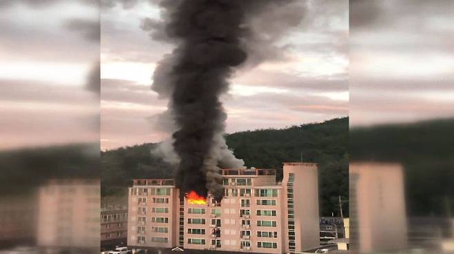 아파트 6층에서 붉은 화염이 솟구칩니다.