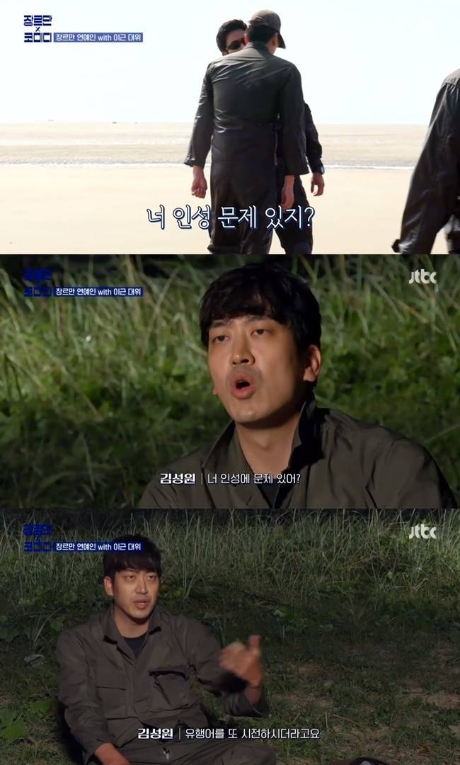 이근 대위는 무인도에 도착하자마자 지옥 훈련을 진행했다. 이근 대위는 입수 훈련을 제대로 수행하지 않는 김성원에게 “너 인성 문제 있어?”라는 유행어를 던졌다. 임우일은 고된 훈련에 헛구역질까지 했다. (사진=JTBC ‘장르만 코미디’ 캡처)