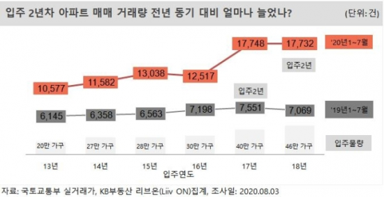 30일 KB국민은행 부동산 리브온에 따르면 국토교통부 실거래가 자료를 기준으로 볼 때 올해 1∼7월 '입주 2년차'(2018년에 입주해 입주기간 2년이 지난 물량) 아파트의 매매량은 1만7732건이다.