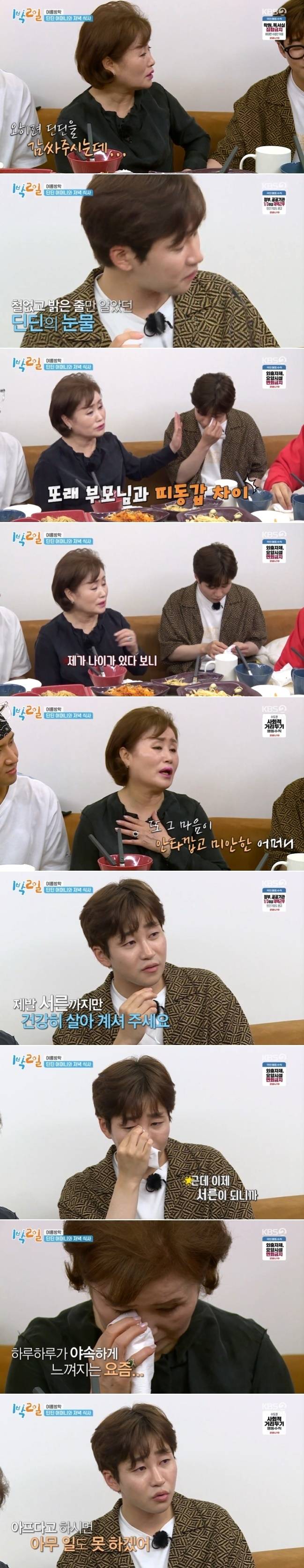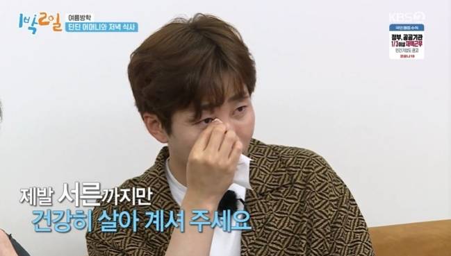 결국 딘딘이 눈물을 보이자, 딘딘 어머니는 "미안한 게 있다. 제가 나이가 있다 보니까, 항상 의식을 하고 있더라. 빨리 엄마 아빠를 모셔야 한다고 생각하는게 안타깝다. 그러지 않아도 된다"고 했다.