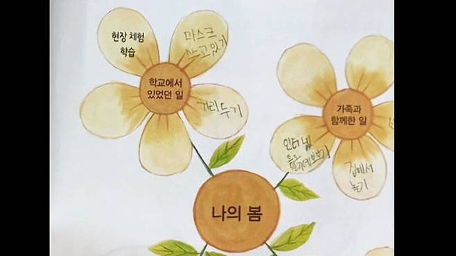 마스크와 떼려야 뗄 수 없었던 올봄, 김 씨의 딸에게 봄은 곧 마스크의 계절이었던 것인데요, 딸이 작성한 마인드맵에는 학교에서 있었던 일로 마스크 쓰고 있기와 거리두기가 있었고, 가족과 함께한 일로는 집에서 놀기라고 적었습니다.