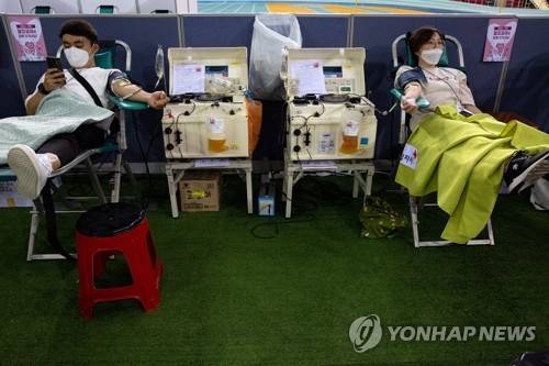 epa08636749 Recovered patients from COVID-19, who are members of Sinchonji church, donate blood plasma for people with COVID-19, in Daegu, South Korea, 31 August 2020. South Korea's Ministry of Food and Drug Safety approved the development of a blood plasma medicine for COVID-19. EPA/JEON HEON-KYUN