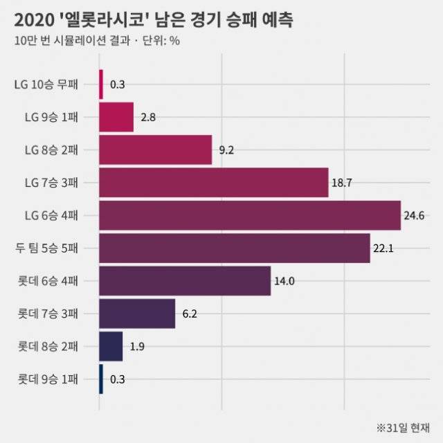 남은 두 팀 경기를 10만 번 시뮬레이션 해보면 LG가 우위를 점할 확률이 55.6%가 나온다. 5승 5패를 포함하면 이 비율은 77.7%까지 올라간다. LG가 10전 전승을 기록할 확률은 있어도 롯데가 전승을 기록할 확률은 없다.