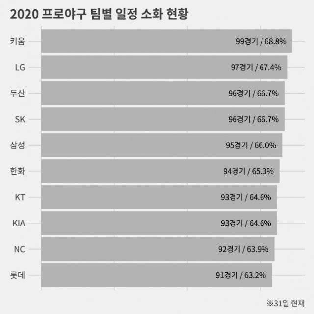 올 시즌 프로야구는 전체 일정 가운데 65.7%를 마감한 상태로 8월을 마감하게 됐다.