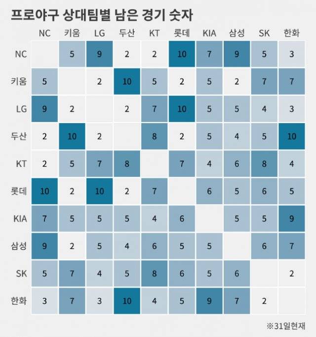 5위 KT를 한 경기로 추격 중인 6위 롯데 역시 LG 그리고 NC와 남은 기간 가장 많은 각 10경기를 치러야 한다.