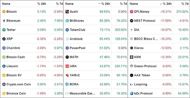 스시스왑 외에는 비트쉐어스(BTS), 토큰클럽(TCT), 아크블록(ABT), 파워풀(CVP), 매스(MATH), 유엠에이(UMA), 얌버전2(YAMV2), 보라(BORA), 메져러블데이터토큰(MDT) 등이 28~85%대 강세를 보였습니다.