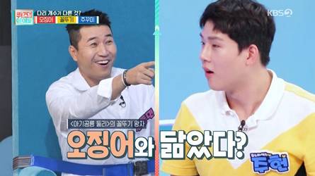 특히 ‘반전 뇌섹남’ 김종민과 ‘황금 촉의 사나이’ 몬스타엑스 주헌의 창과 방패를 방불케 하는 팽팽한 대결이 흥미진진하게 펼쳐져 눈길을 끌었다. 김종민은 가끔씩 터져 나오는 천재력으로 ‘간헐적 천재’, ‘반전 뇌섹남’이라는 별명이 붙어 있었던 바. 이 날도 역시 김종민은 시작부터 “닉쿤과 강남은 내가 확실하게 이길 것 같다”며 팀킬도 불사하겠다는 엉뚱한 발언으로 현장을 폭소케 했다.