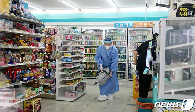 (대전=뉴스1) 김기태 기자 = 대전 대덕구 비래동 순복음대전우리교회에서 신종 코로나바이러스 감염증(코로나19) 확진자 8명이 추가로 발생한 1일 오전 대덕구 방역 관계자가 확진자가 다녀간 편의점을 방역하고 있다. 2020.9.1/뉴스1