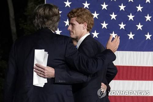 U.S. Rep. Joe Kennedy III looks to his brother Matthew, left, after speaking outside his campaign headquarters in Watertown, Mass., after conceding defeat to incumbent U.S. Sen. Edward Markey, Tuesday, Sept. 1, 2020, in the Massachusetts Democratic Senate primary. Listening at left are his twin brother Matthew and wife Lauren. (AP Photo/Charles Krupa)