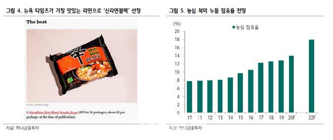 심 연구원은 “미국인 사이에서 라면이 식사 대용으로 급부상하면서 재구매율이 유의미하게 상승하고 있다”며 “뉴욕타임즈가 세계에서 가장 맛있는 라면으로 ‘신라면 블랙’을 선정하는 등 현지 평가도 우호적”이라고 설명했다.