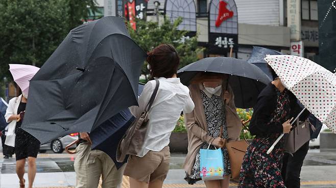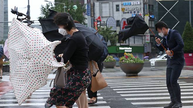 제9호 태풍 '마이삭'이 동해상으로 빠져나갔지만 여전히 강한 바람이 불고 있는 3일 오전 서울대병원에서 한 시민의 우산이 바람에 뒤집히고 있다.