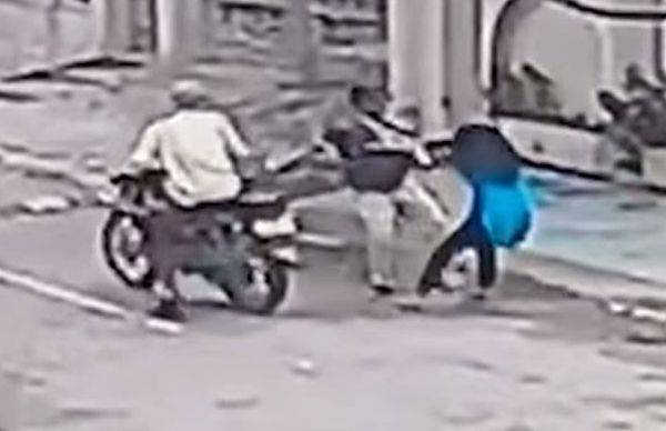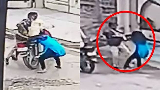 거의 동시에 오토바이도 빠른 속도로 출발하면서 잠깐 질질 끌려가기도 했지만, 쿠마리 양은 뒤에 앉은 남성을 오토바이에서 끌어 내리는 데 성공합니다. 남성은 쿠마리 양에게 둔기를 휘두르며 가까스로 다시 오토바이에 올라탔지만, 쿠마리 양은 굴하지 않고 남성을 꽉 붙잡고 매달립니다.
