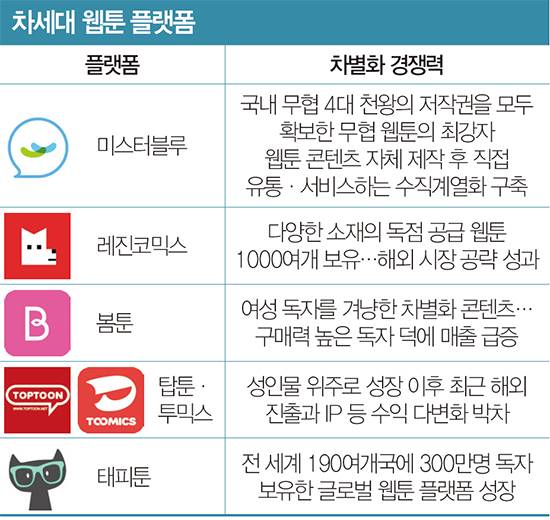 웹툰 업계 관계자는 “콘텐츠를 무료로 제공하는 대기업과 달리 중소 웹툰업체들은 성인 타깃 콘텐츠에서 수익을 확보하며 몸집을 키웠다. 설립 초기부터 해외를 공략했고 국내 웹툰 플랫폼의 40%가 해외에 지사를 둘 정도로 글로벌 진출에 적극적으로 나서고 있어 성장 가능성이 크다”고 설명했다.