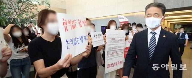| “합의 무효” 항의하는 전공의들 4일 서울 중구 한국건강증진개발원 앞에서 박능후 보건복지부 장관이 항의 시위를 벌이는 전공의 수십 명의 앞을 걸어가고 있다. 이날 개발원에서 복지부와 대한의사협회의 합의문 서명식이 열릴 예정이었으나 전공의 시위로 인해 정부서울청사로 장소가 바뀌었다. 송은석 기자 silverstone@donga.com |