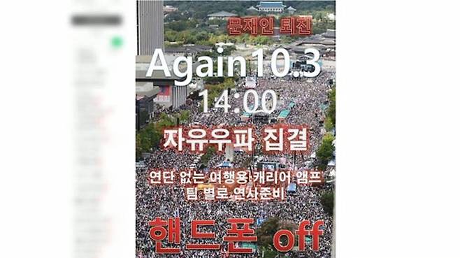 포스터에는 개천절인 10월 3일 오후 2시에 '자유우파 집결'을 알리는 문구가 쓰여있습니다. 또 '핸드폰 off'라는 문구도 새겨져 있습니다.