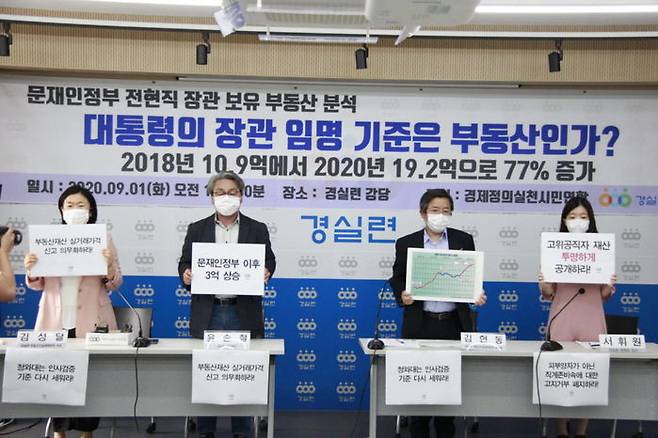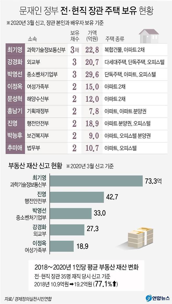 A. 문재인 대통령이 임명한 장관들의 1인당 평균 부동산 재산은 임기 초인 2018년에 비해 올해 77% 넘게 증가했다고 경실련은 밝혔습니다. 2018∼2020년 재직했던 전·현직 장관 35명의 재산 신고 내용을 분석해보니, 재직 당시 신고한 1인당 평균 부동산 재산은 2018년 10억 9천만 원에서 올해 19억 2천만 원으로 77.1% 증가했습니다.