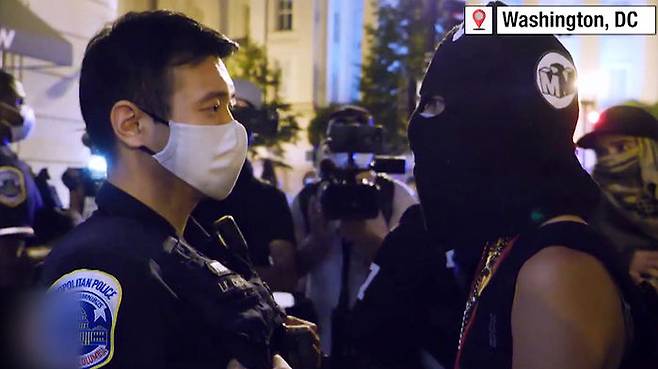 영상 촬영 시점은 밝히지 않았지만 시위가 벌어진 곳은 워싱턴 DC라고 하는데요, 복면을 쓴 시위 참가자가 아시아계로 보이는 경찰에게 영어로 욕설 구호를 외치는 장면이 포착됐습니다.