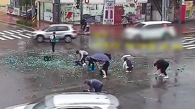 이때 횡단보도 앞에 서 있던 학생 세 명이 주저 없이 달려가 깨진 술병들을 치웁니다. 다른 학생들도 하나, 둘 다가가 도로 정리를 돕는데요, 비가 와서 옷이 젖을 수도 있고, 유리 조각에 다칠 수도 있는 상황인데도 아랑곳하지 않았습니다.