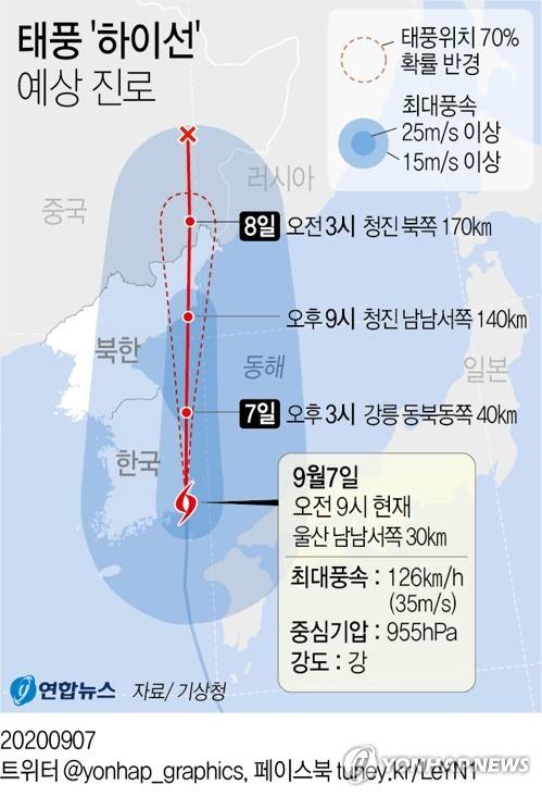 7일 기상청에 따르면 하이선은 오전 9시 기준으로 울산 남남서쪽 약 30㎞ 부근 육상에서 시속 48㎞의 속도로 북진 중이다.