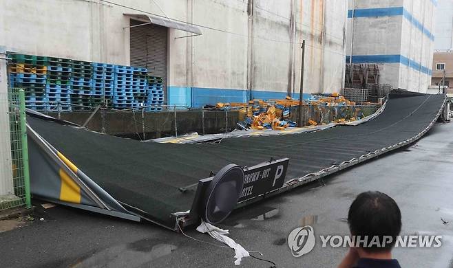 (창원=연합뉴스) 김동민 기자 = 태풍 '하이선' 영향으로 7일 오전 경남 창원시 마산합포구 한 숙박업소 야외 주차장 천막이 붕괴돼 있다. 2020.9.7