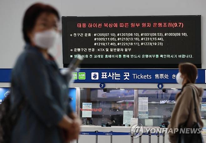 (서울=연합뉴스) 윤동진 기자 = 7일 오전 서울역 전광판에 '제10호 태풍 하이선' 북상에 따른 일부 열차 운행조정 안내문이 나오고 있다. 2020.9.7