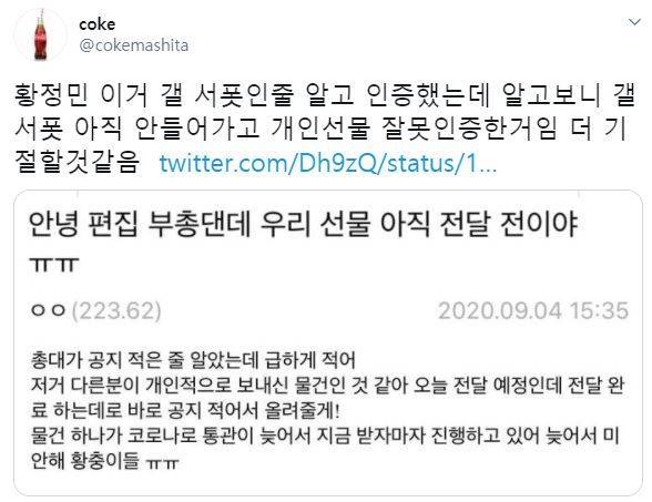그런데 황정민이 남긴 글엔 재미있는 반전이 있었는데요, 황정민이 인증한 선물은 해당 커뮤니티에서 보낸 선물이 아니었습니다. 황정민의 글을 본 커뮤니티 관계자가 "우리가 준비한 선물은 아직 전달 전이다. 저 선물은 다른 팬분이 개인적으로 보내신 것 같다"고 글을 남겼고, 이에 황정민이 "너희가 보낸 줄 알았어. 선물을 받아봤어야 알지"라고 글을 남겨 웃음을 더했습니다.