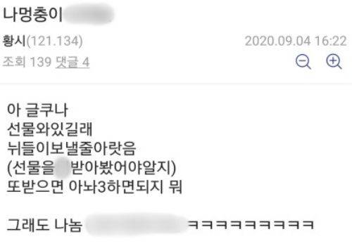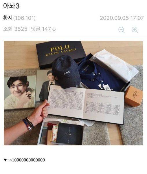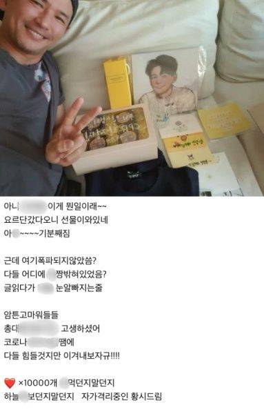 황정민은 "선물 받으면 다시 글을 올리겠다"며 자신의 글을 삭제했는데요, 이후 해당 커뮤니티에서 받은 선물과 함께 귀여운 손 하트 인증샷을 다시 올리며 애정을 드러냈습니다.