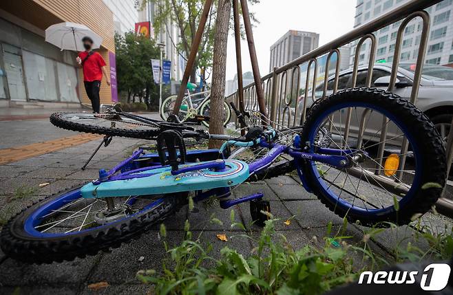 (수원=뉴스1) 이재명 기자 = 제10호 태풍 '하이선' 영향으로 전국에 비가 내리고 있는 7일 오후 경기도 수원시 팔달구 인계동의 한 거리에 자전거가 쓰러져 있다. 2020.9.7/뉴스1