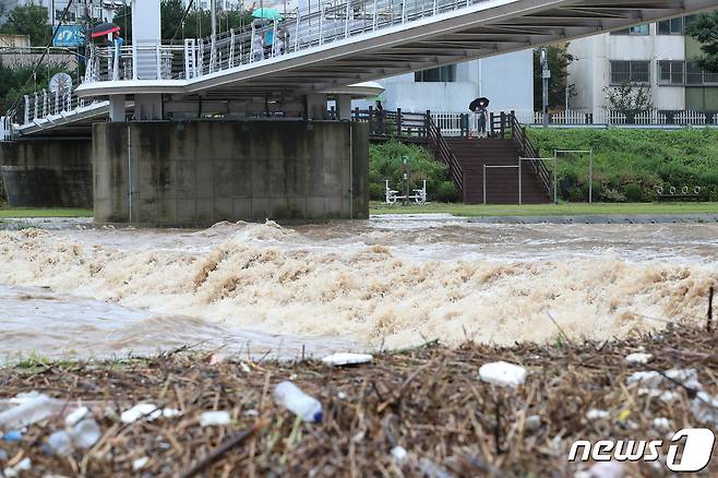 (청도=뉴스1) 공정식 기자 = 제10호 태풍 하이선이 폭우를 뿌리고 지나간 7일 오전 경북 경산시 남천이 범람해 흙탕물 파도를 일으키며 흐르고 있다. 2020.9.7/뉴스1